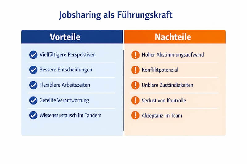 Typische Herausforderungen sind höherer Abstimmungsaufwand, unterschiedliche Führungsstile, Unsicherheit im Team bei unklarer Kommunikation und persönliche Egos. Jobsharing verstärkt, was ohnehin da ist – deshalb ist es oft ein echter Reife-Test.