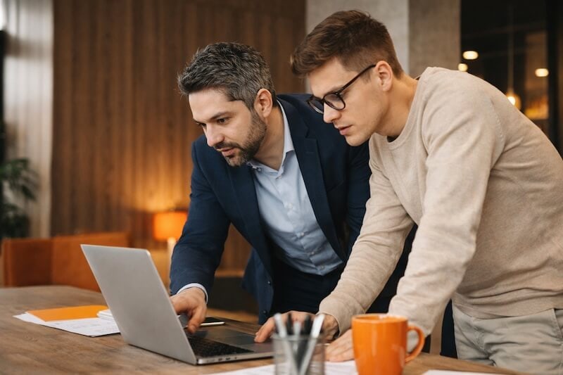 Succession-Tandem: Eine erfahrene Führungskraft arbeitet befristet mit einer Nachfolgeperson zusammen – Wissenstransfer mit klarer Übergabeperspektive.